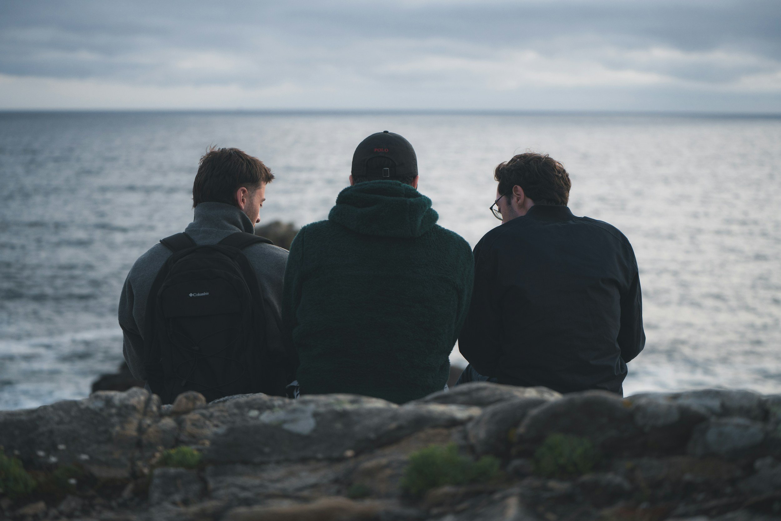 • Three friends sitting on rocks by the water, facing the ocean, engaged in conversation on a cloudy day.
